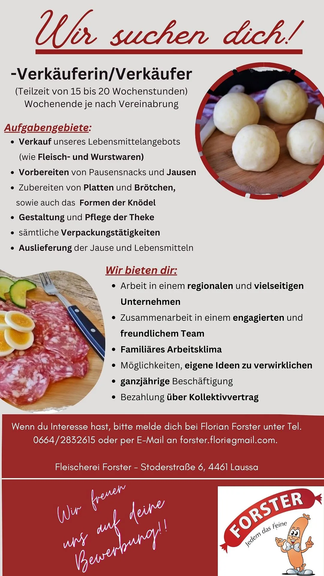 In der Fleischerei FORSTER in Laussa in Oberösterreich dreht sich alles um Vielfalt und Regionalität. Wir kaufen nur in der Gegend ein, im Umkreis von bis zu 25 Kilometern. Das hält Transportwege kurz. Mit hauseigener Schlachtung bereiten wir Fleisch vor, stellen Wurst und Schinken zu. Sie erhalten bei uns Spezialitäten aus Wild, Geflügel, Schwein, Kalb, Rind, Ziegen und Schafen.