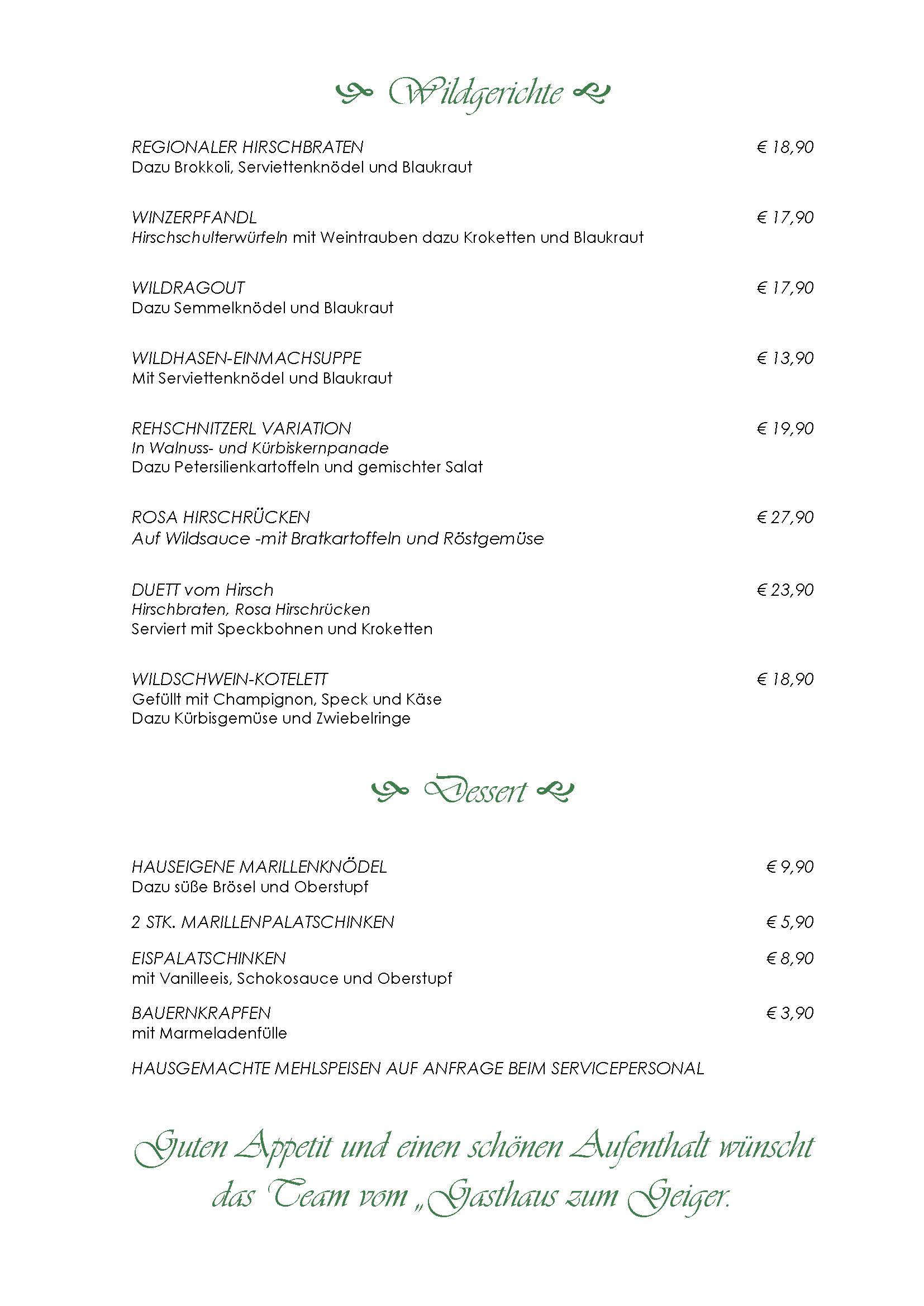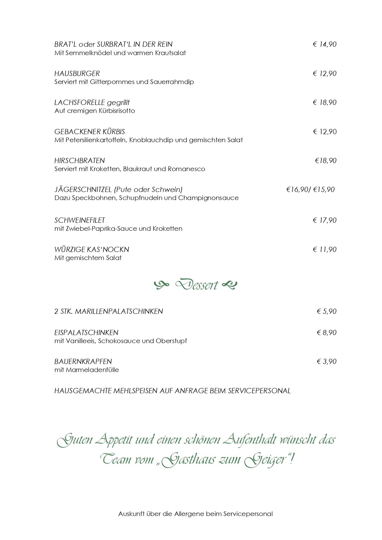 Unsere Speisekarte beim Gasthaus zum Geiger